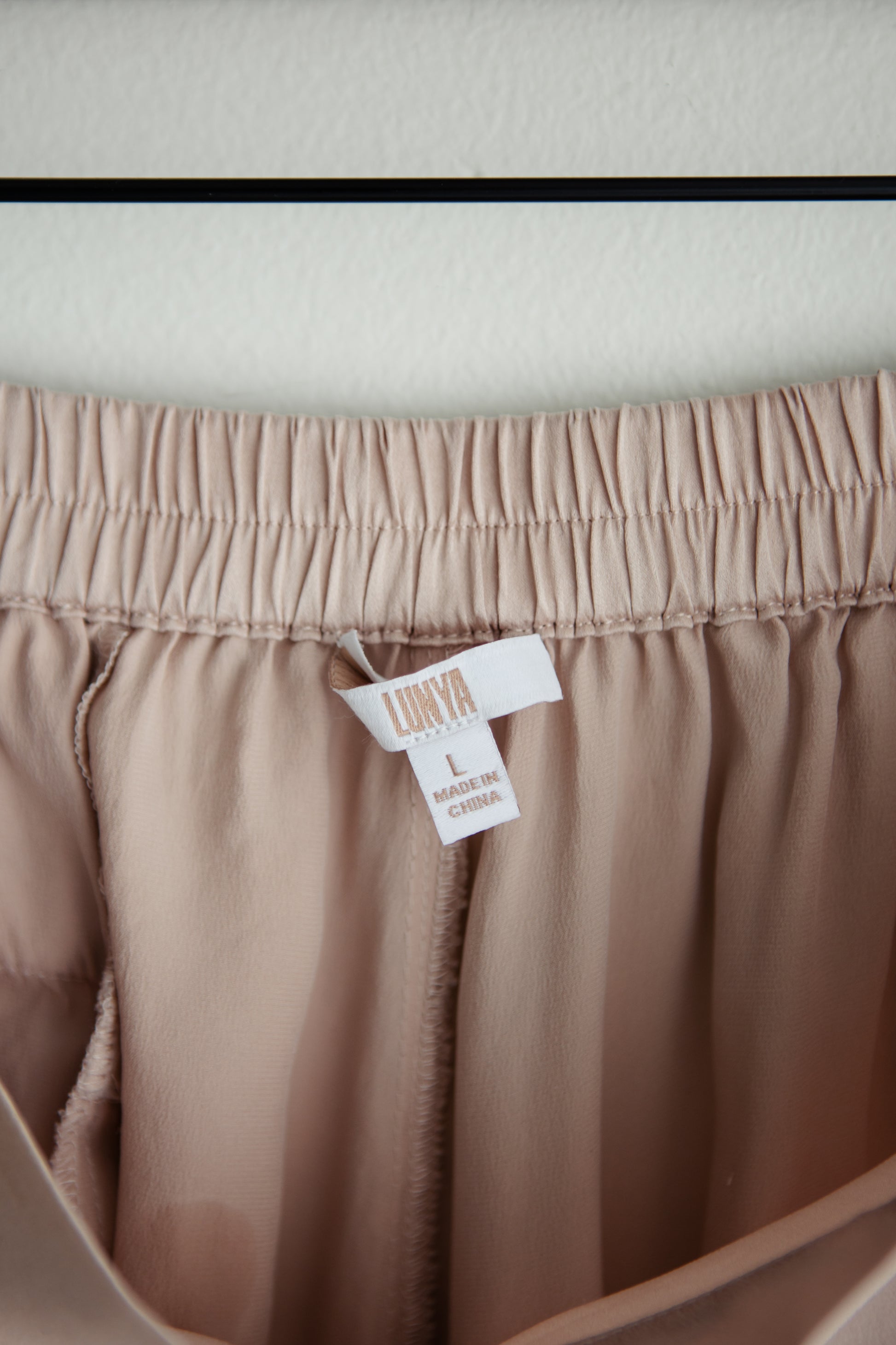 LUNYA 100% mulberry washable silk delicate pink tulip pajama bottoms.