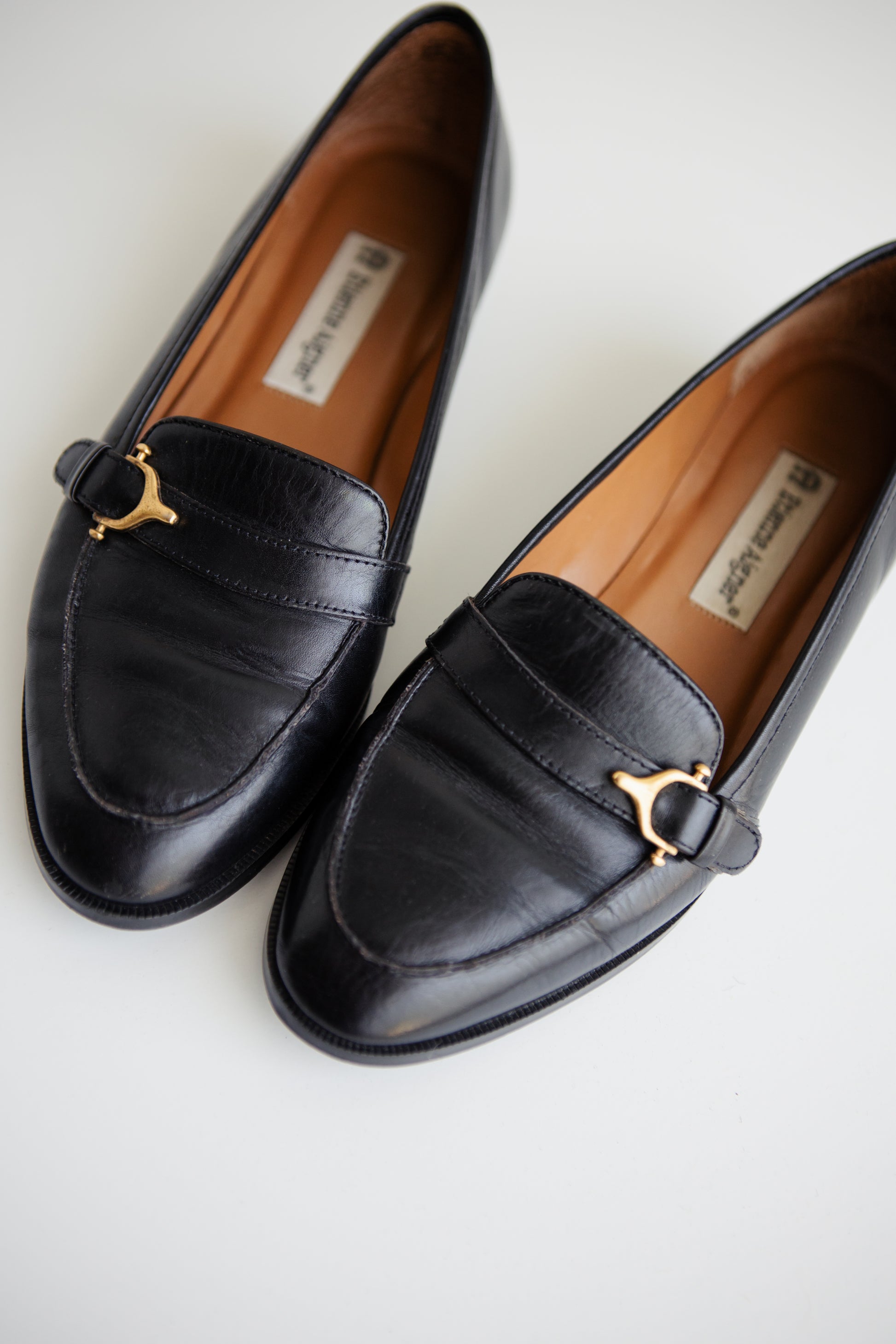 vintage black leather loafers with brass metal horsebit buckle