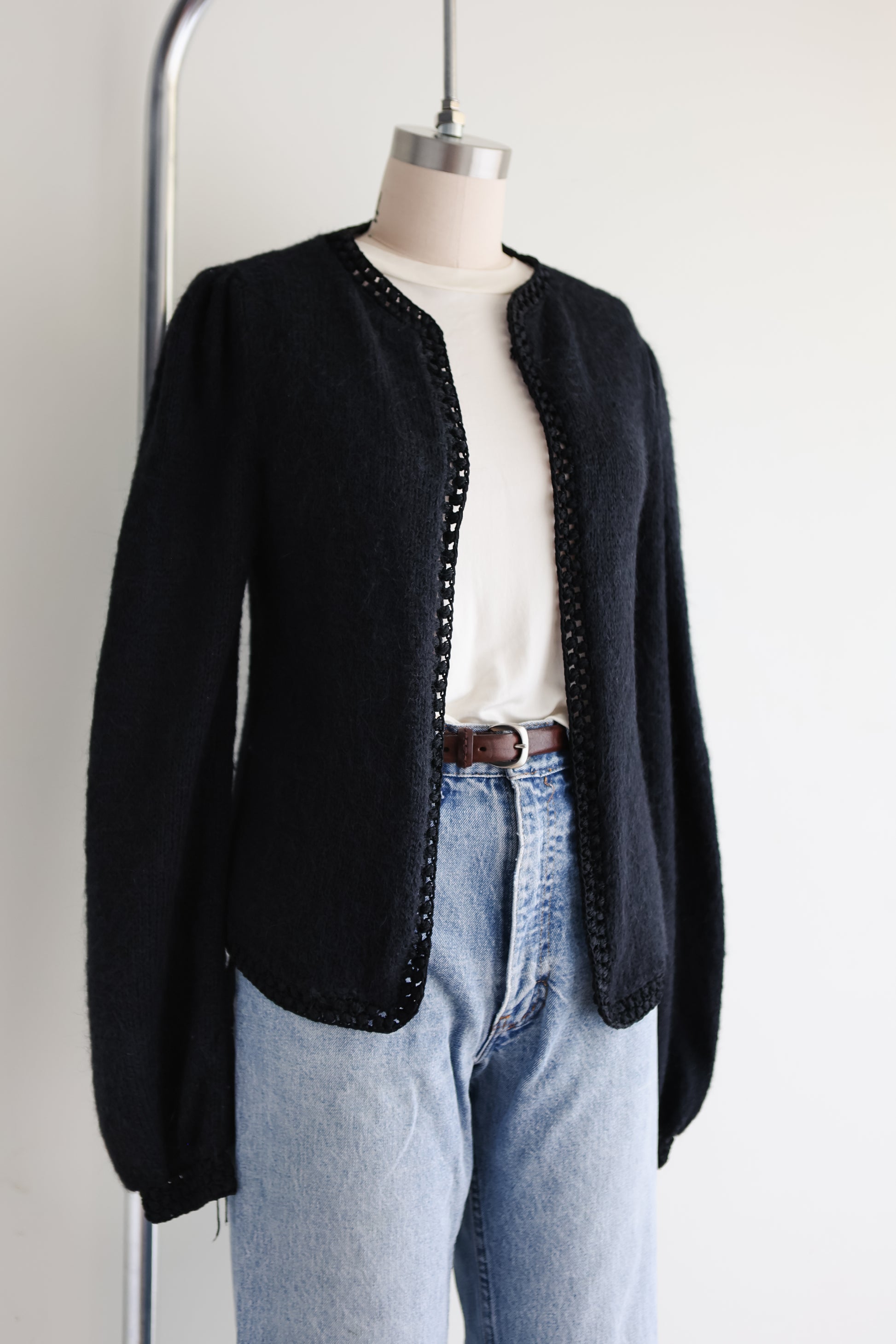 vintage black mohair-angora blend open front cardigan with crochet trim. soft, not itchy!