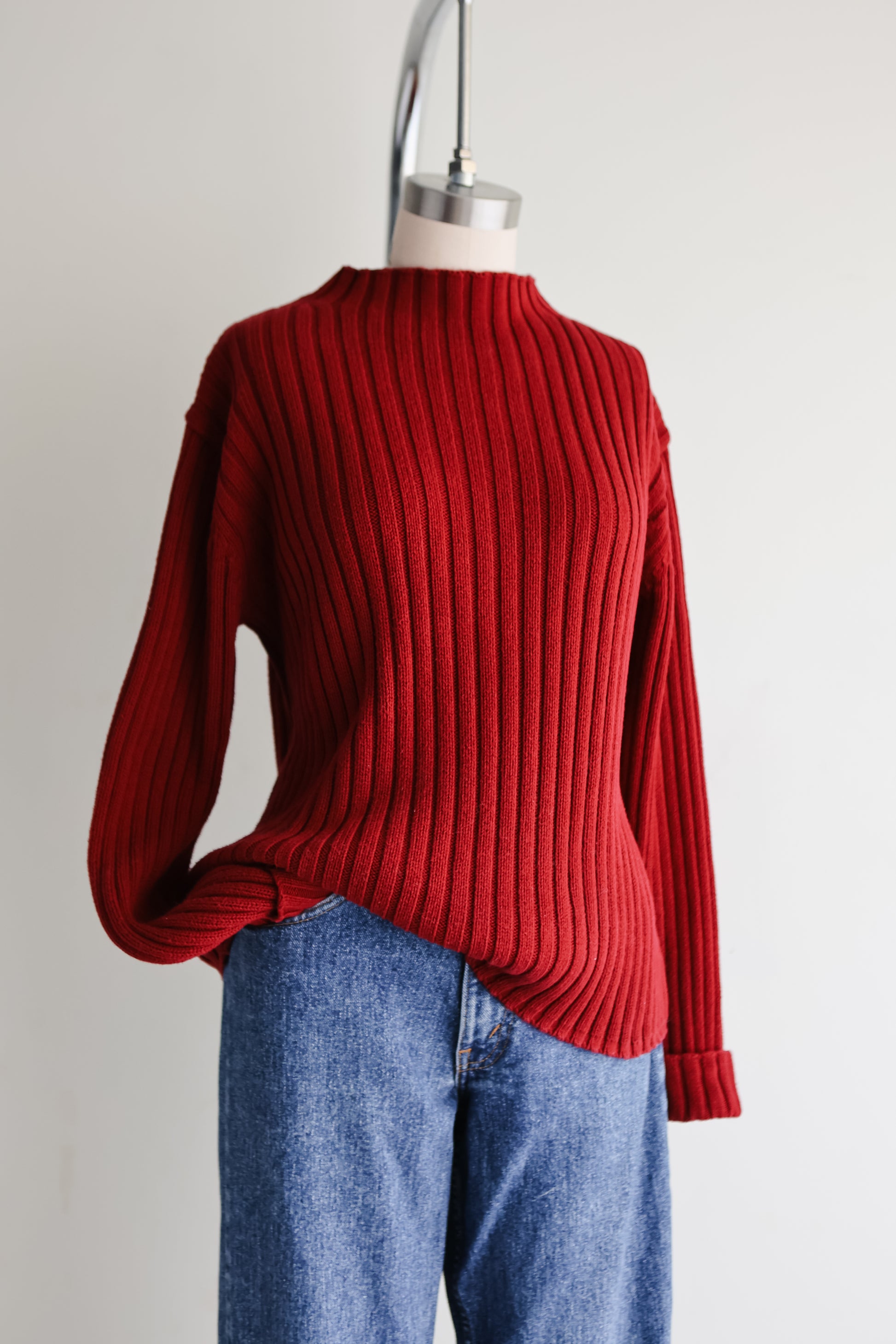 vintage currant red 100% cotton ribbed knit sweater with rollneck collar and cuffed sleeves.