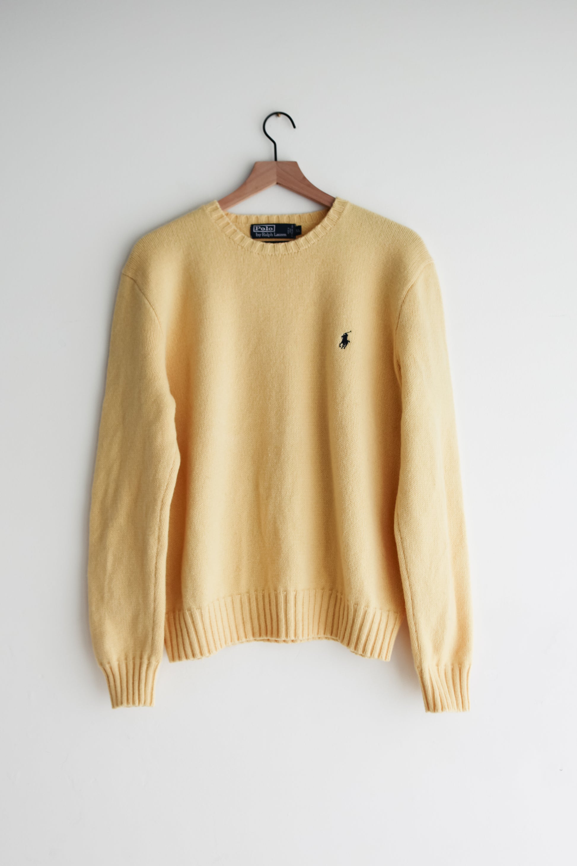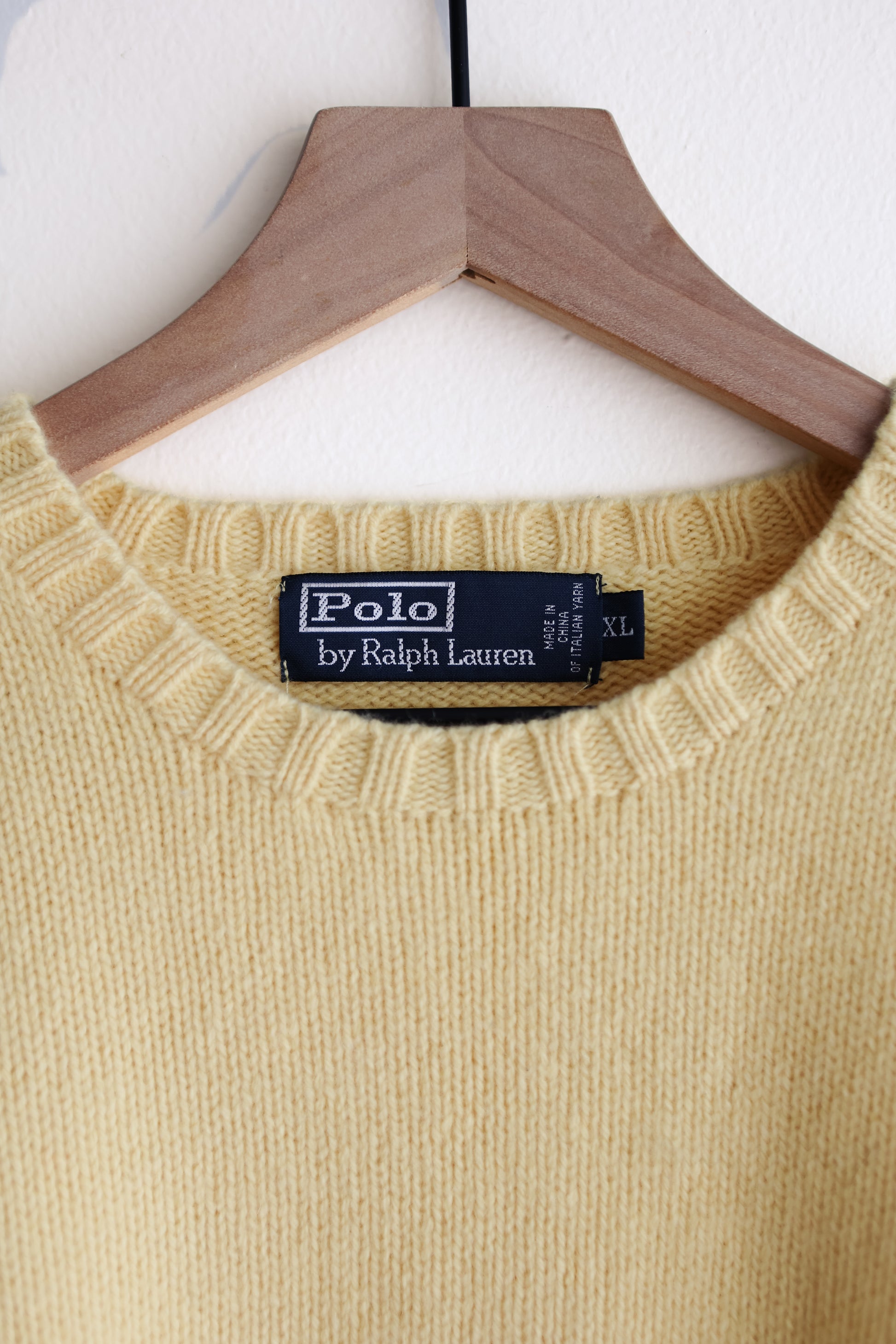 vintage butter yellow cashmere-wool knit oversized sweater with embroidered navy pony logo POLO by Ralph Lauren.