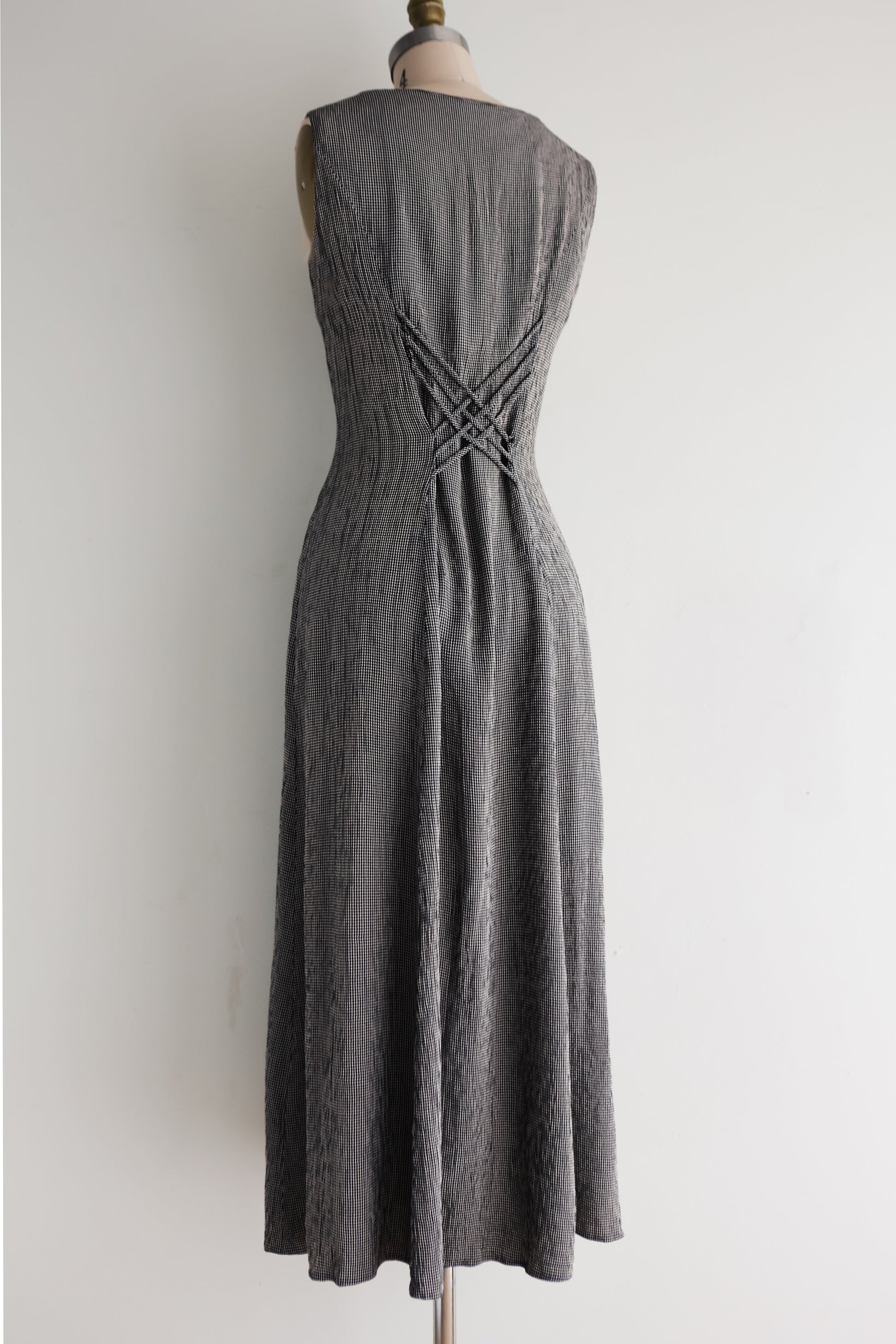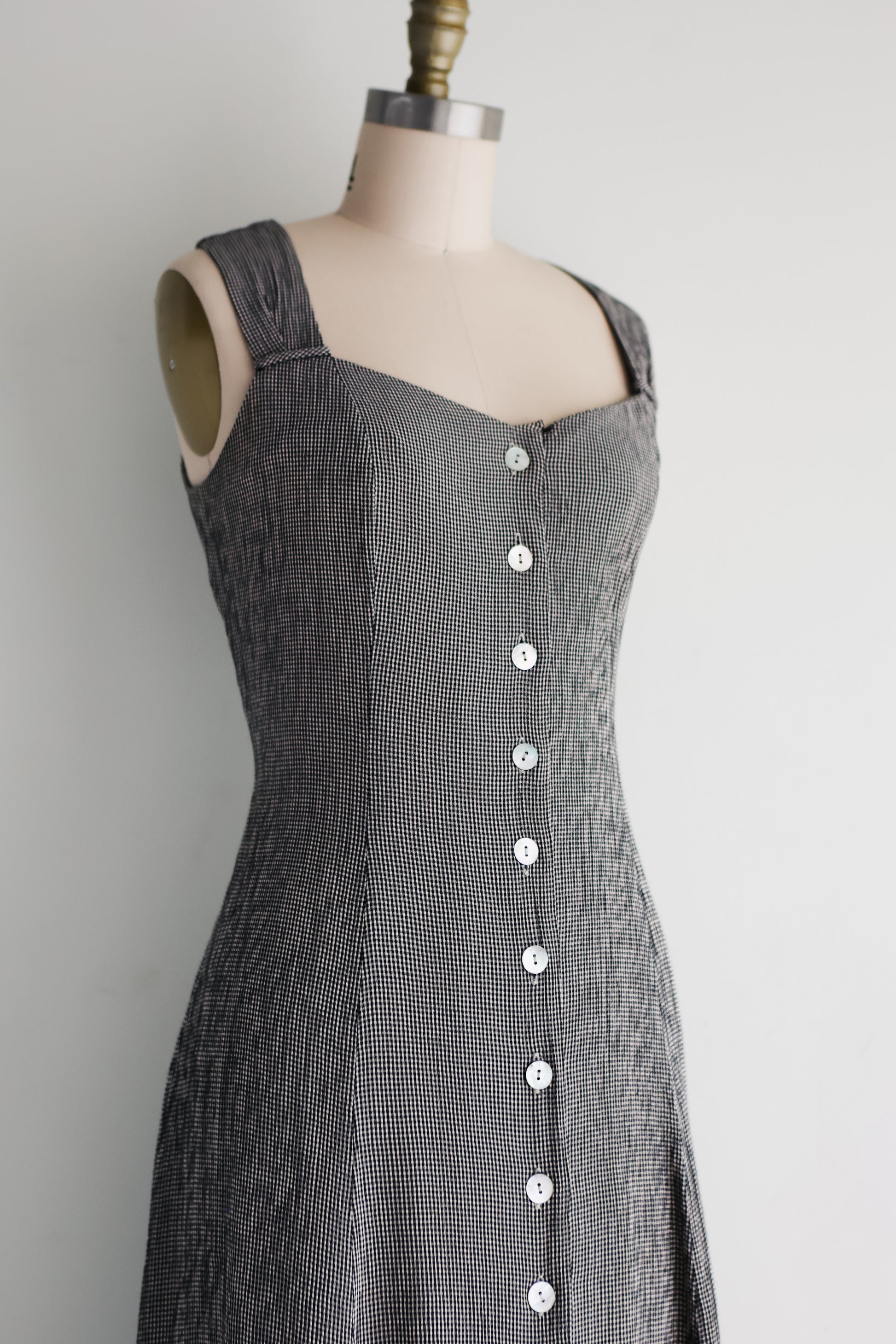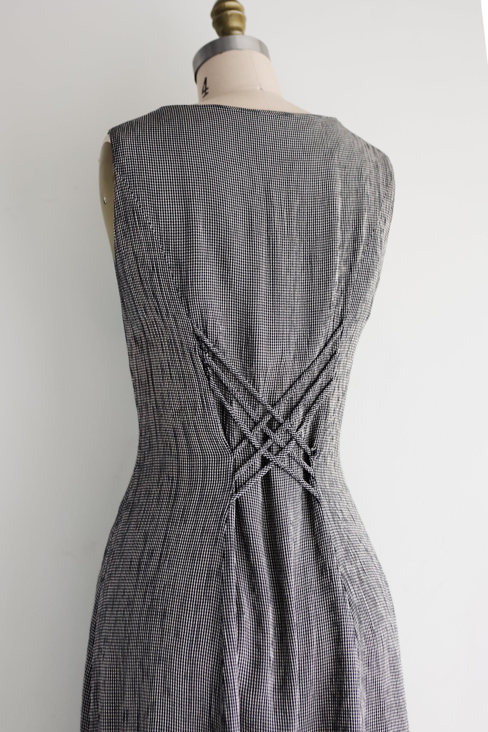 vintage micro check rayon sundress with mother of pearl button front and back lacing.
