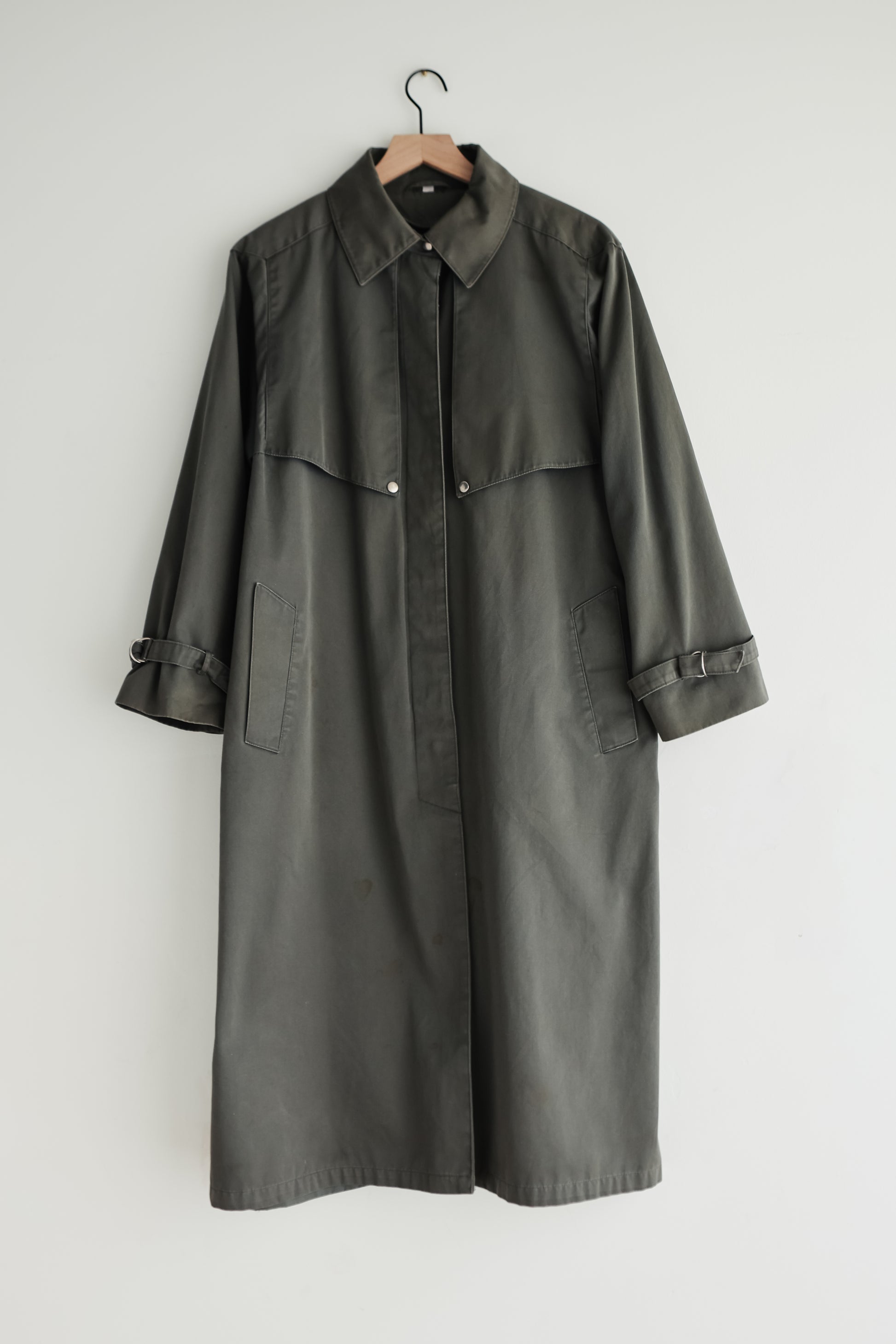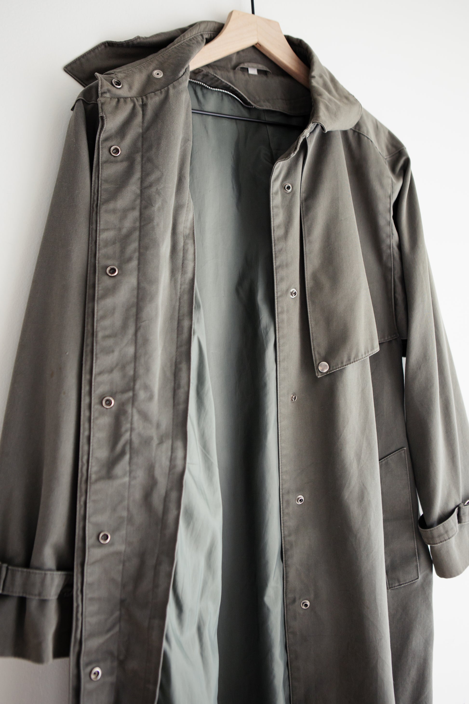 vintage army green canvas cotton trench coat with snap button front, hidden placket, bated cuffs and two snap button front panels.