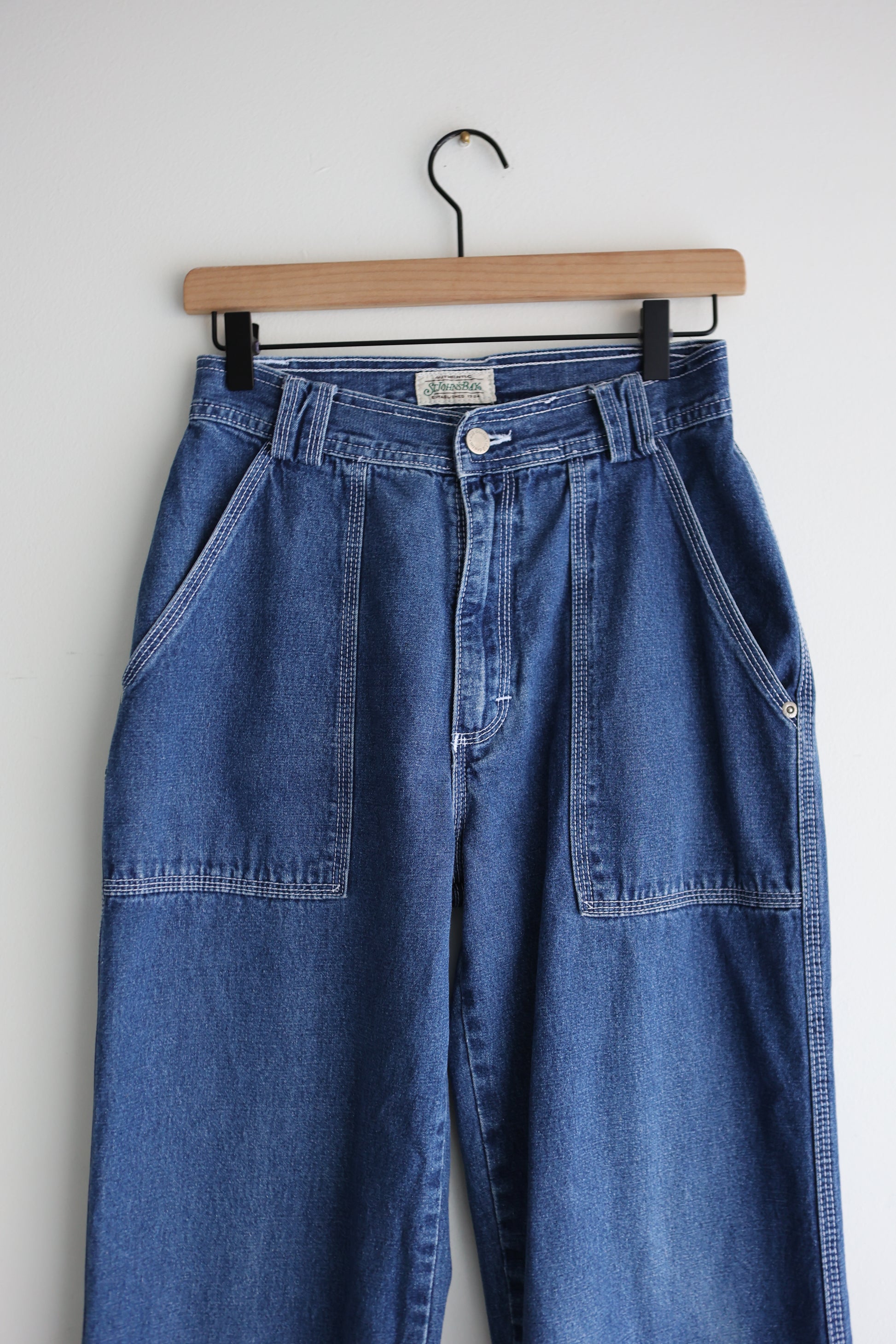vintage carpenter style jeans white contrast stitching and four pockets.