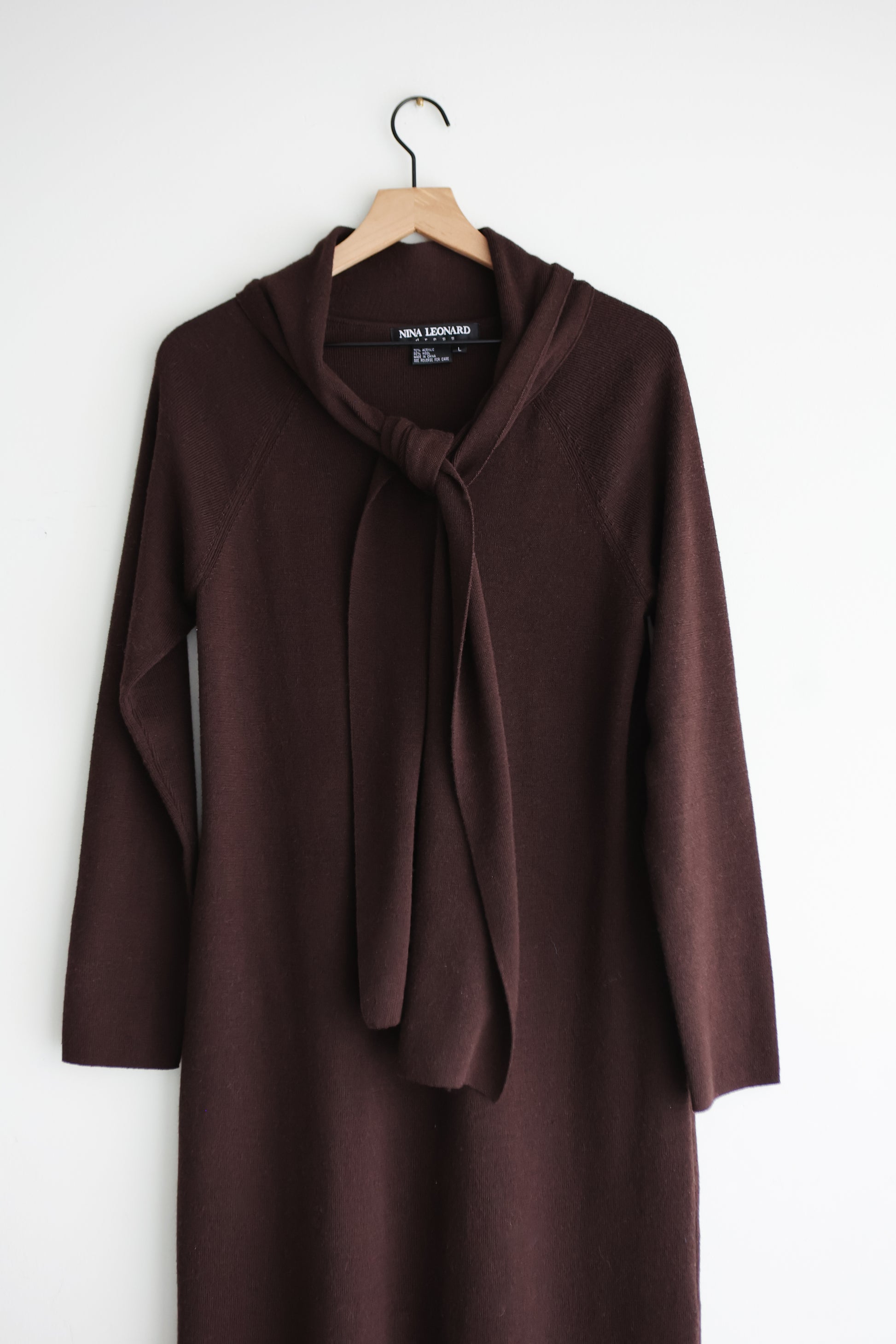 vintage dark chocolate wool-acrylic blend sweater knit maxi dress with attached neck scarf. soft on the skin - no need to worry about itchy wool.