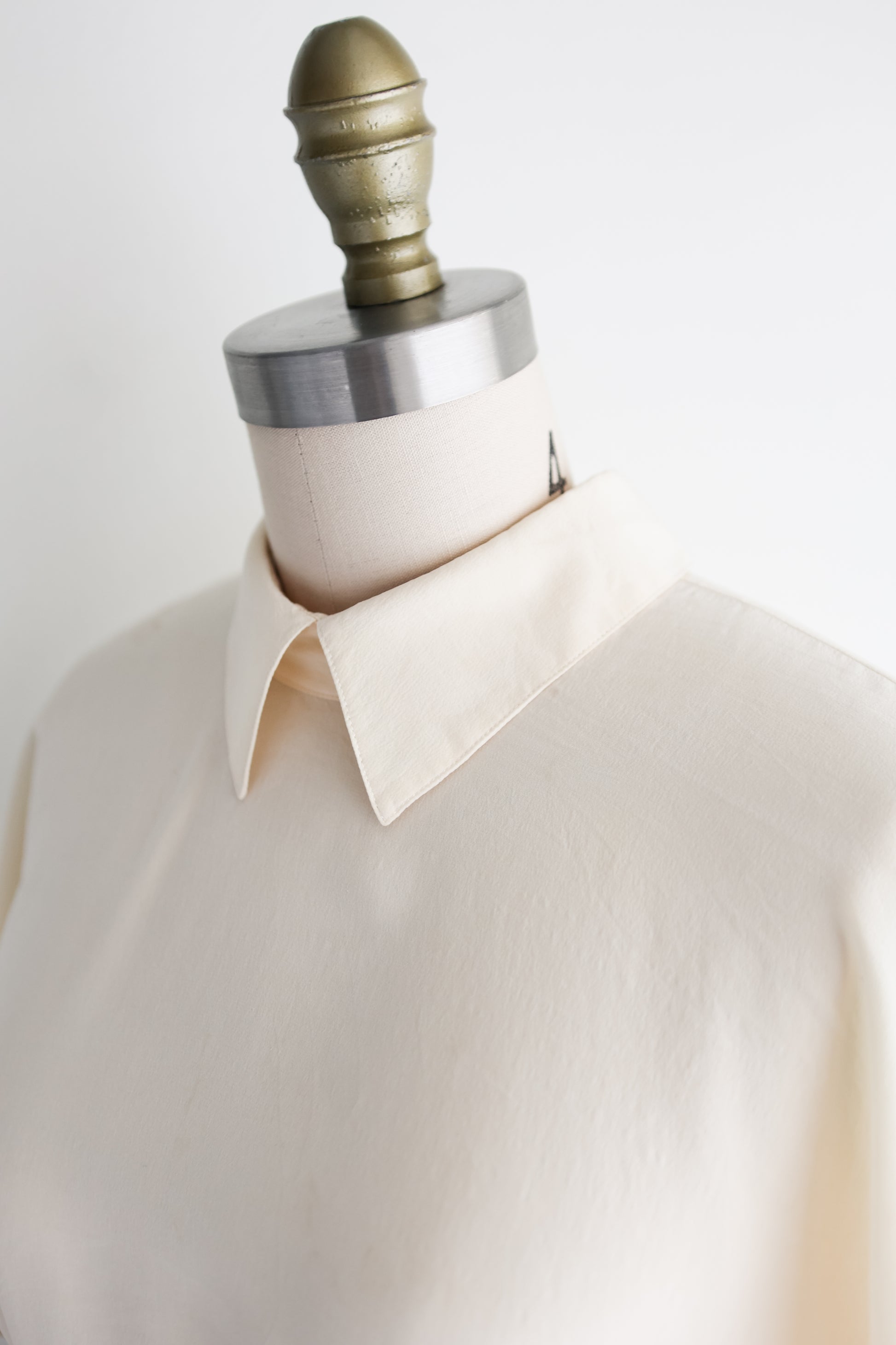 vintage cream crepe 100% silk blouse with pointed collar, dolman sleeves and back buttons.