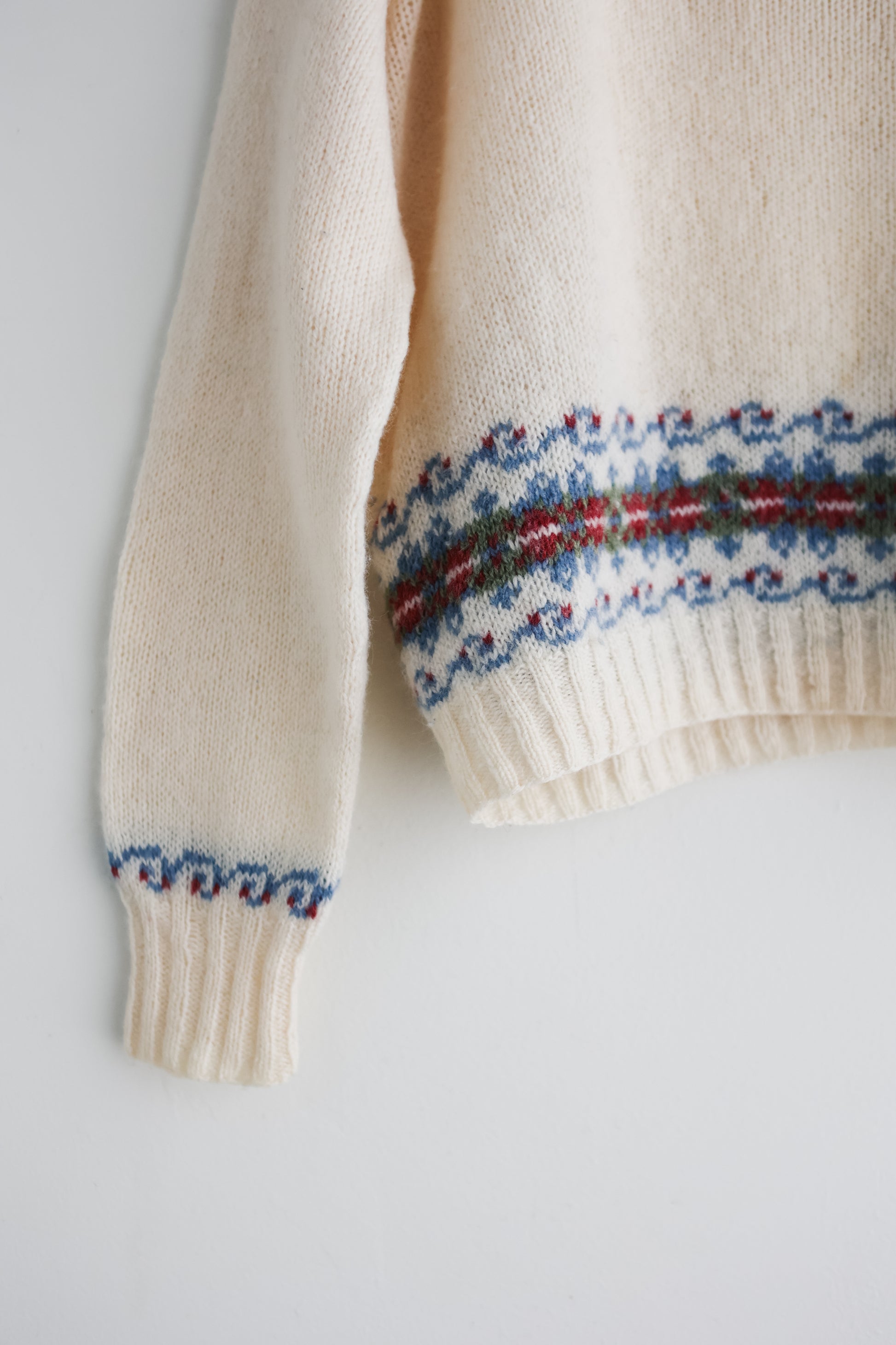 vintage soft and lightweight wool cropped sweater in seam color with blue and pink fair isle knit band.