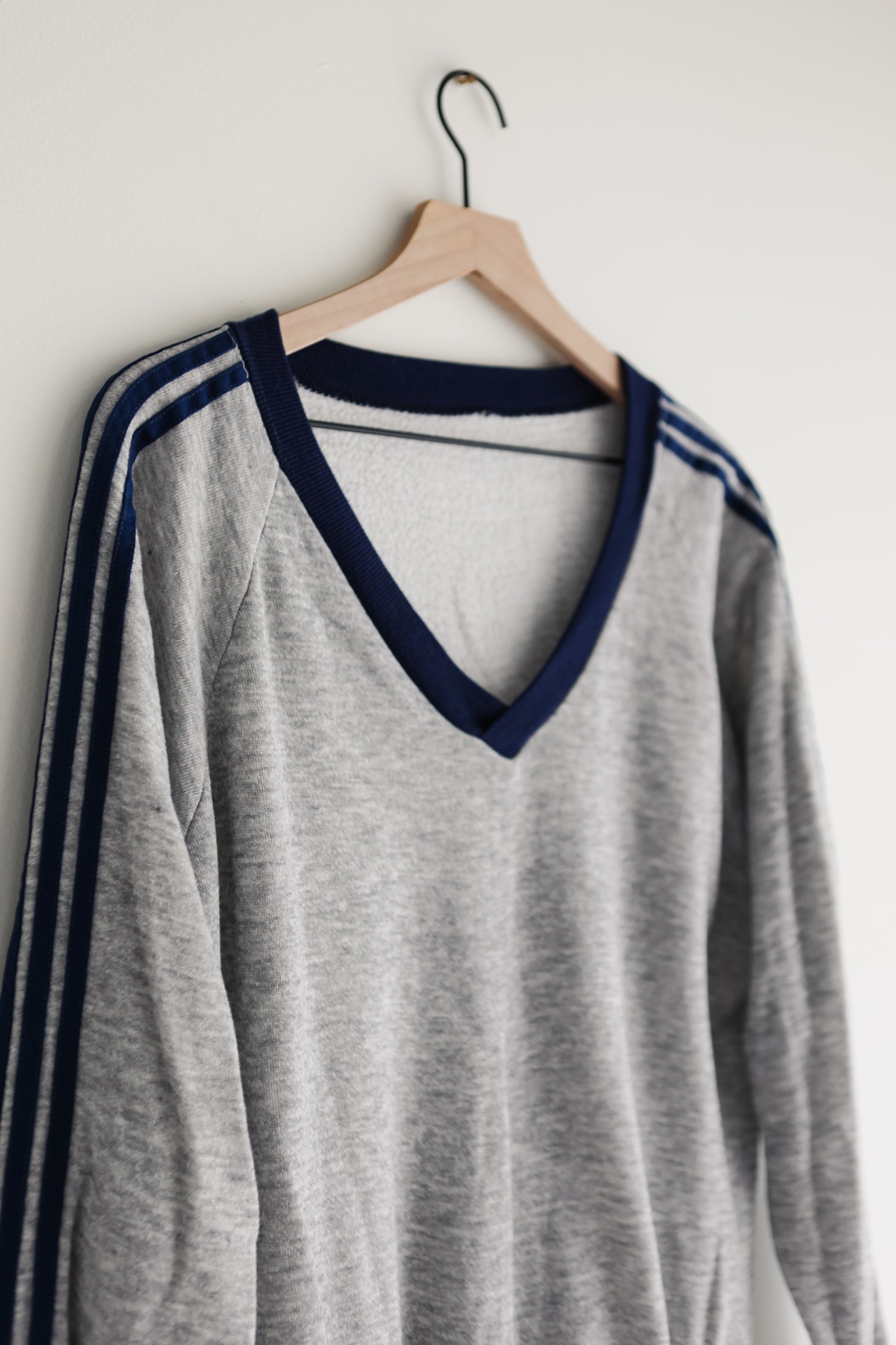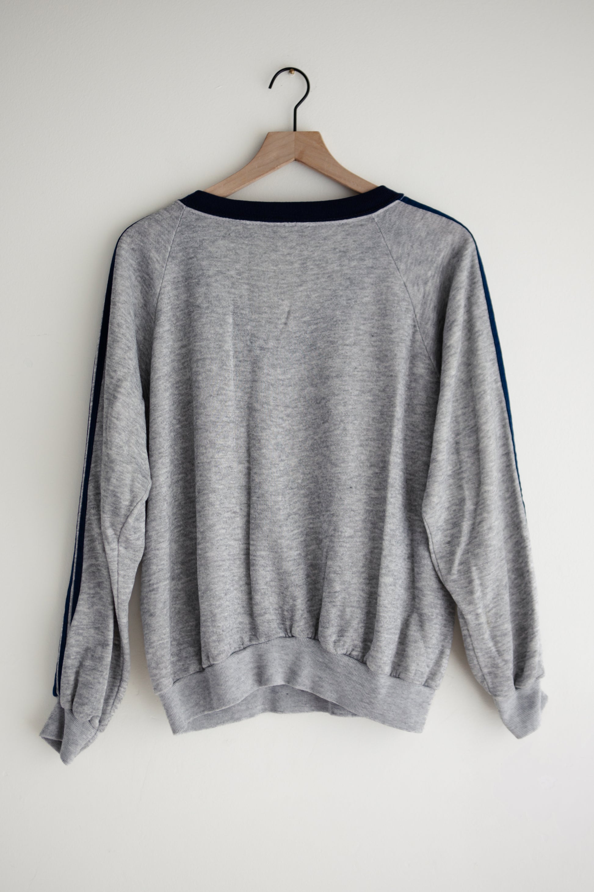 vintage heather grey soft cotton worn-in sweatshirt with navy striped raglan sleeve and