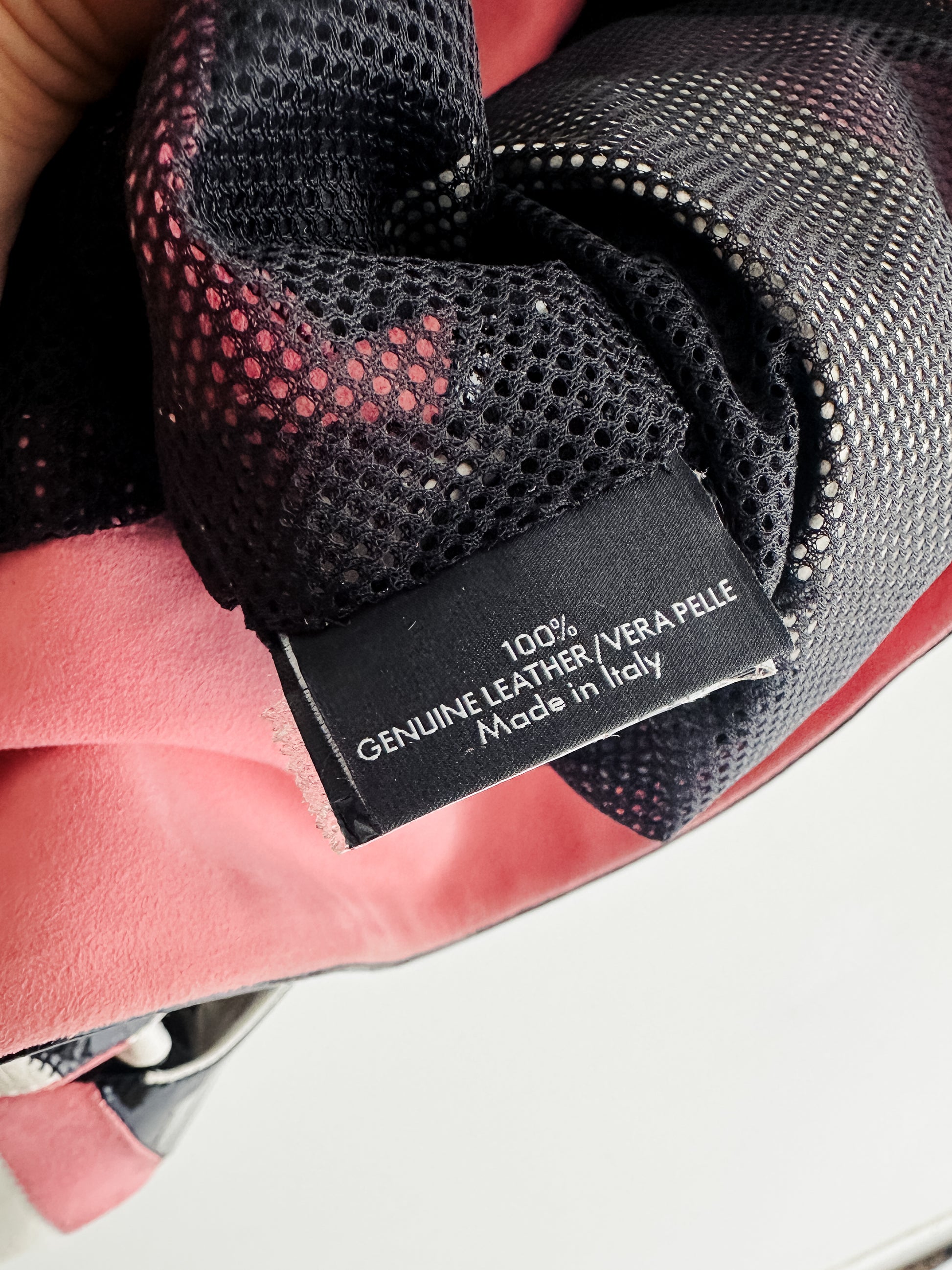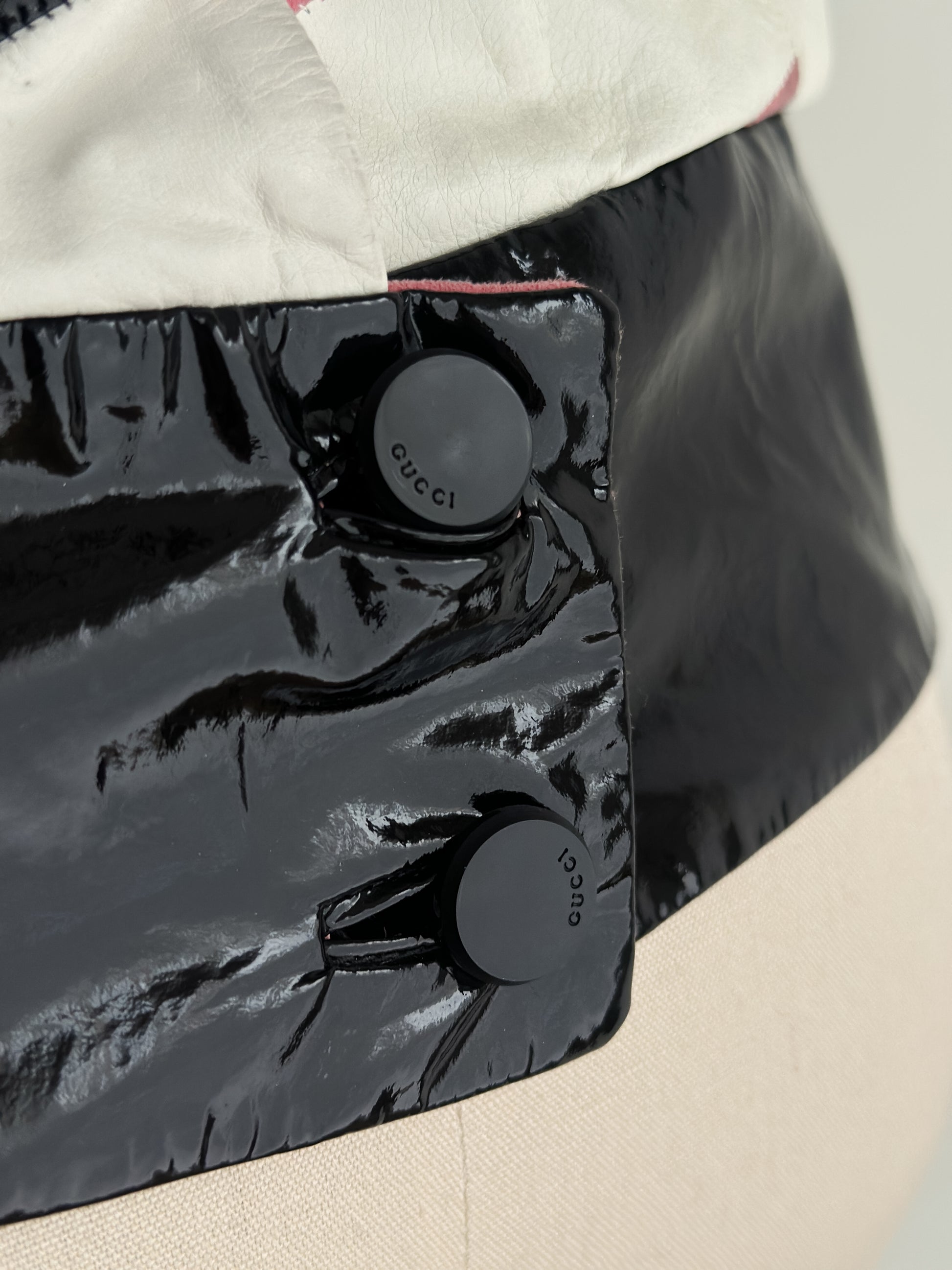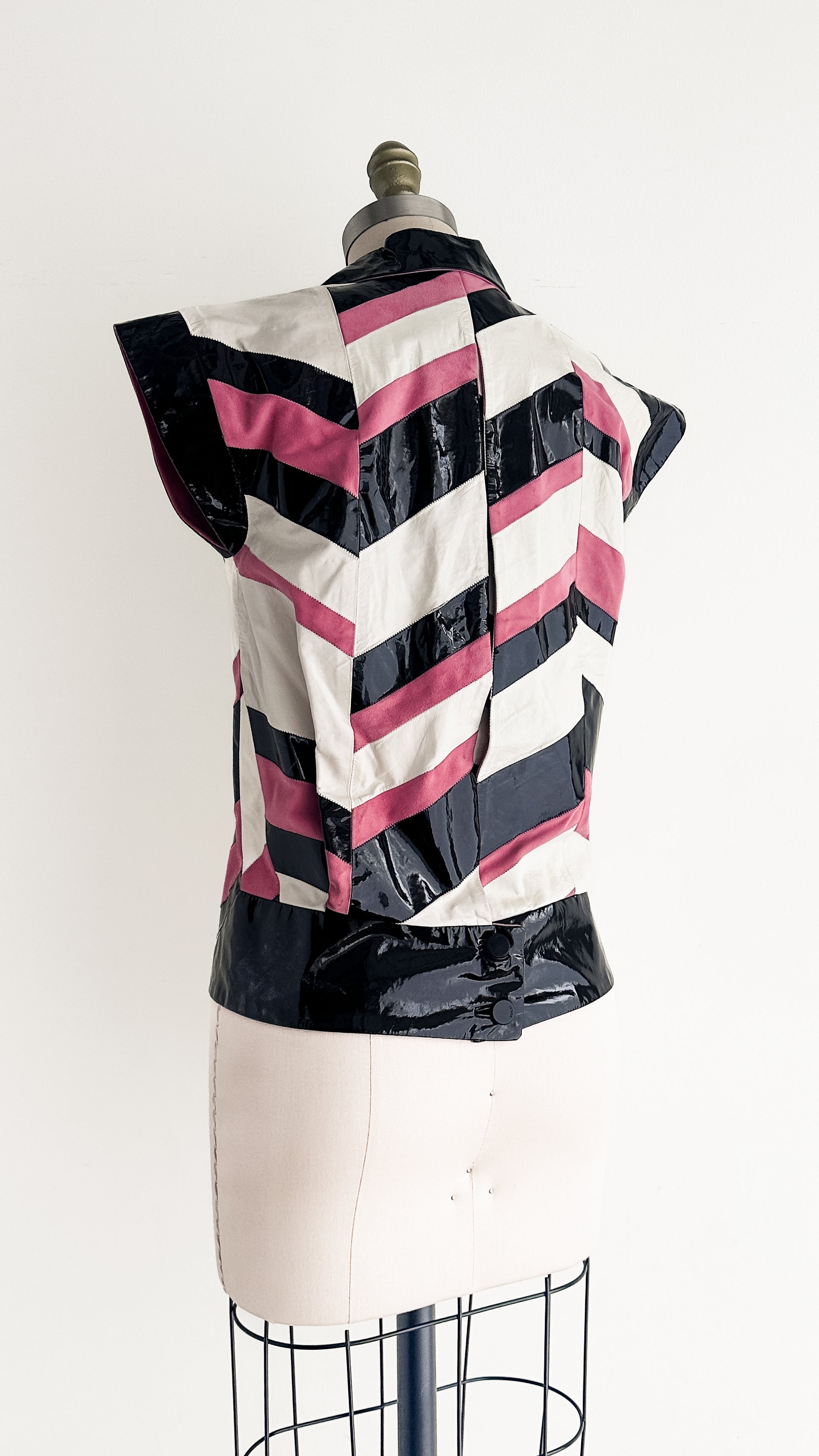 Vintage Gucci / Frida Giannini chevron patchwork leather top in black, blush pink, and ivory. Made in Italy from 100% genuine leather (vera pelle). Features a striking chevron panel design combining glossy patent leather with smooth matte leather, creating a structured, statement silhouette. Sleeveless cut with an open front and mesh interior lining for comfort. Highly collectible runway piece!