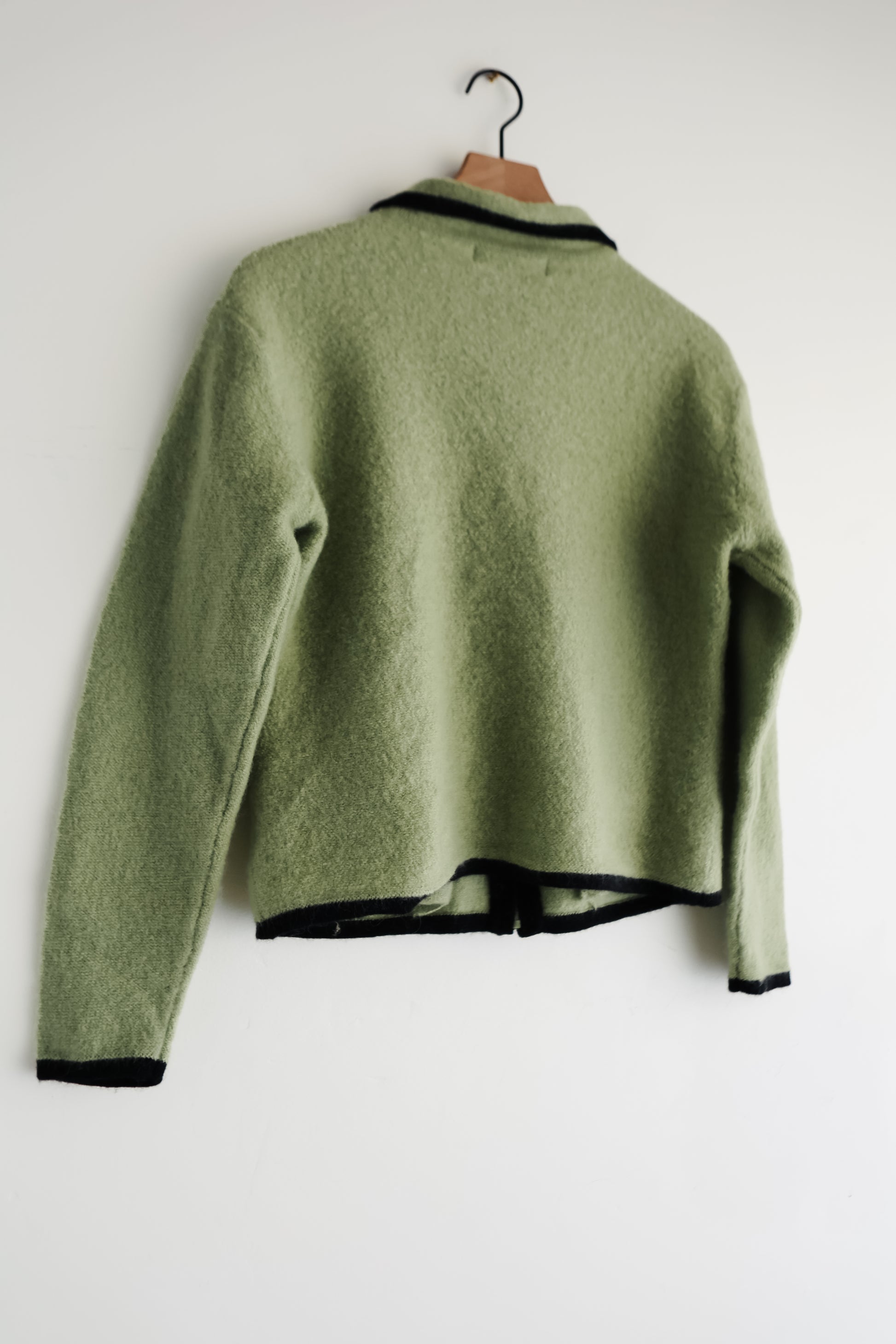 vintage pea green soft 100% wool knit cardigan sweater with zipper front, pointed collar, two pockets and black trim. by Herman Geist