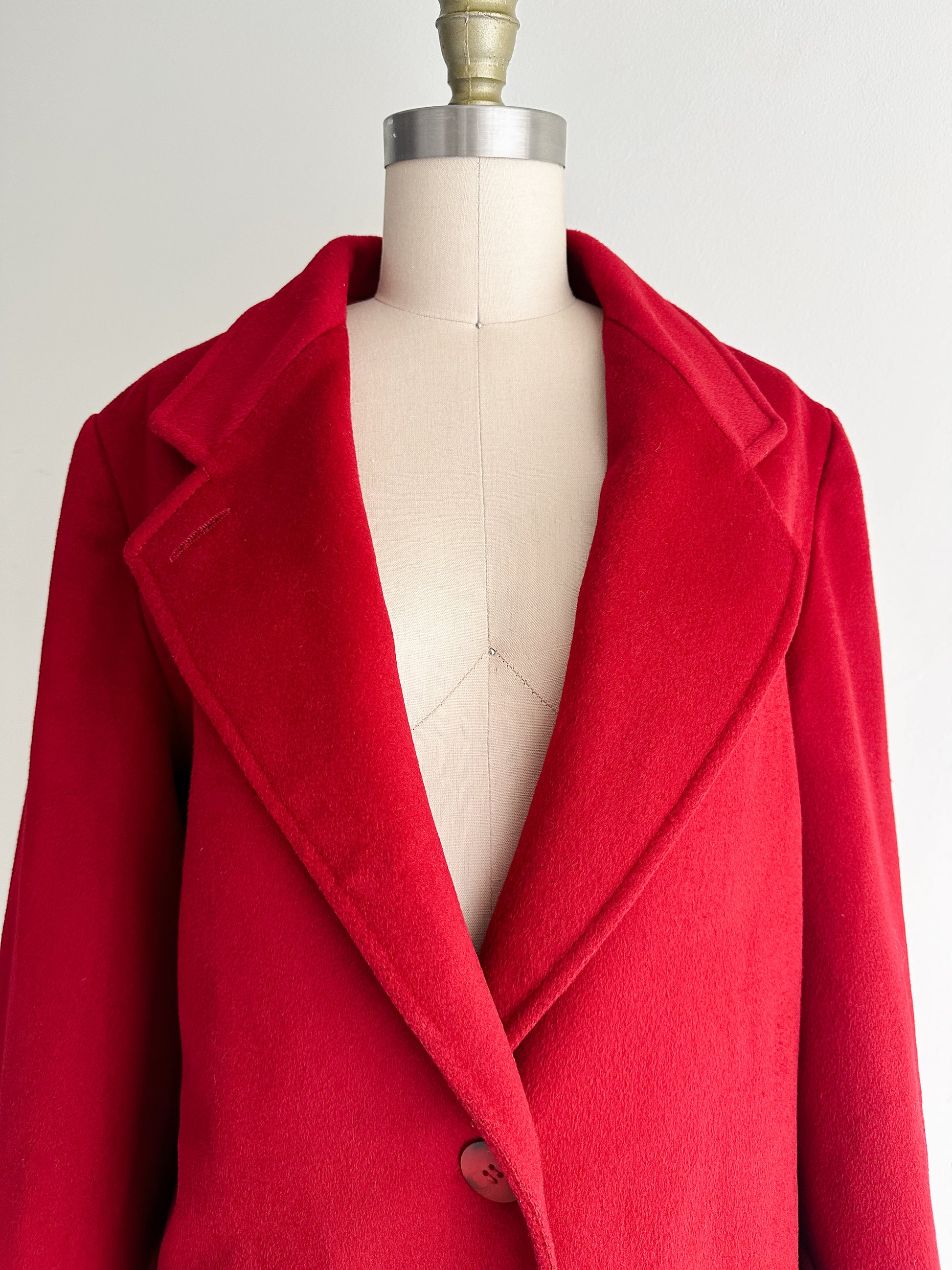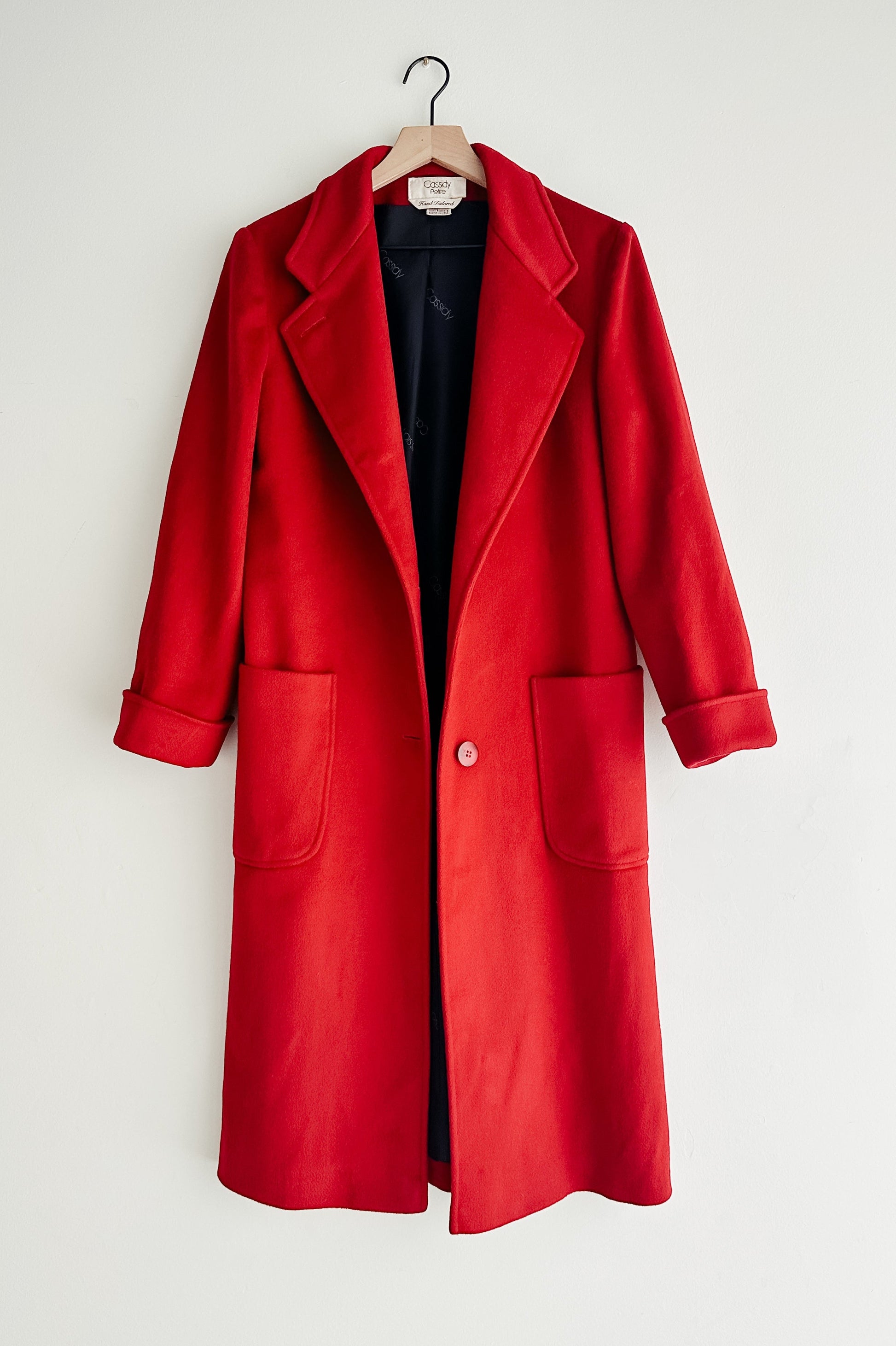 vintage deep red 100% wool winter coat with notched collar, side patch pockets, full lining, back button placket and two front button closures. by Cassidy
