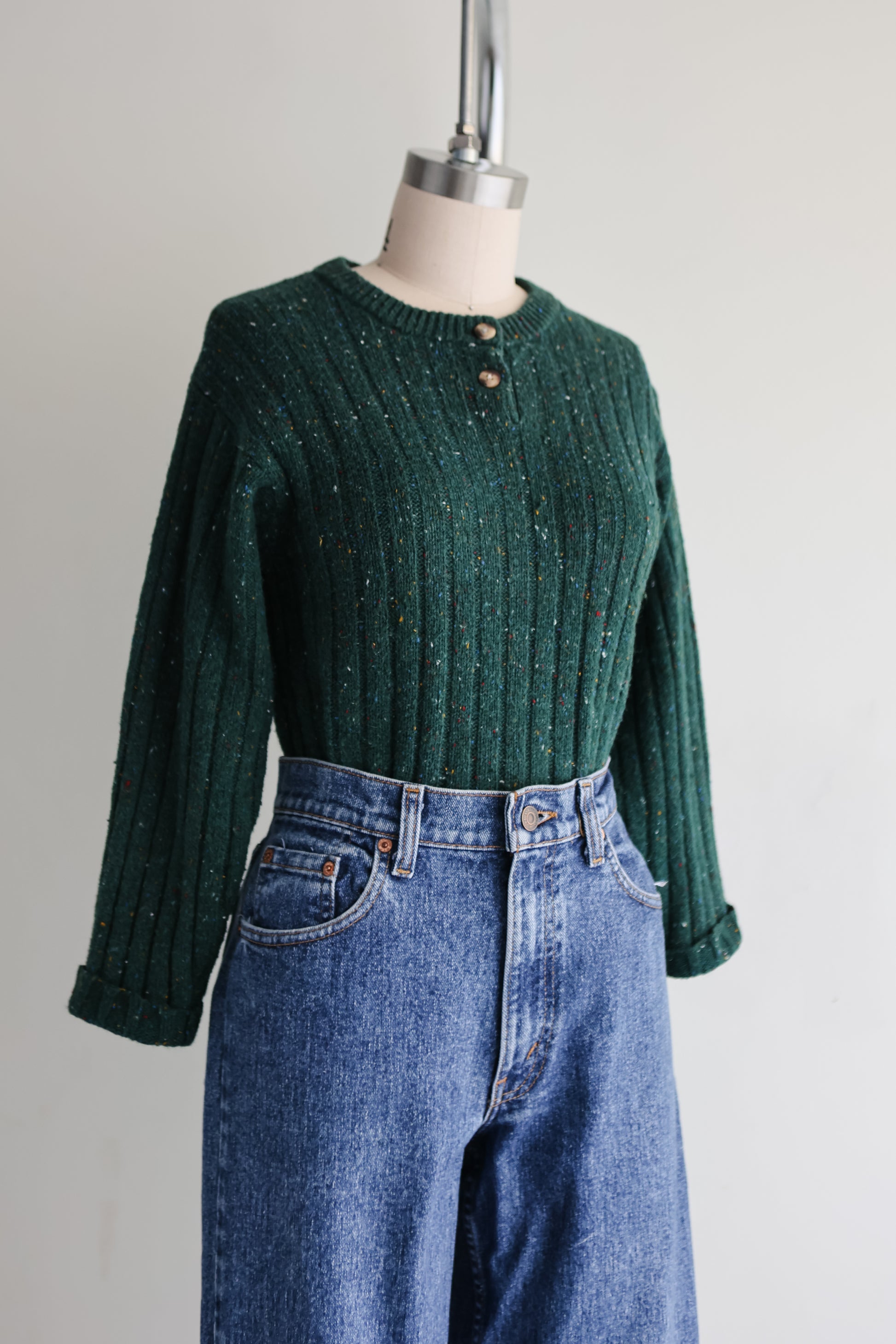 vintage spruce green ribbed marled wool-ramie blend sweater with two buttons at the nape.