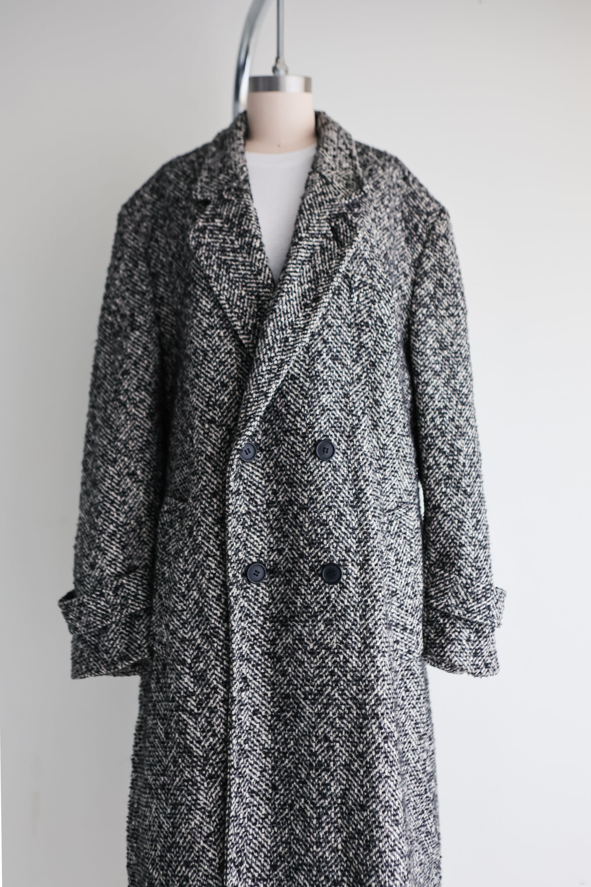 vintage black and white flecked herringbone tweed wool coat with double breasted button front, two side front pockets, notched collar, belted sleeve cuffs, back waist belt and full lining.
