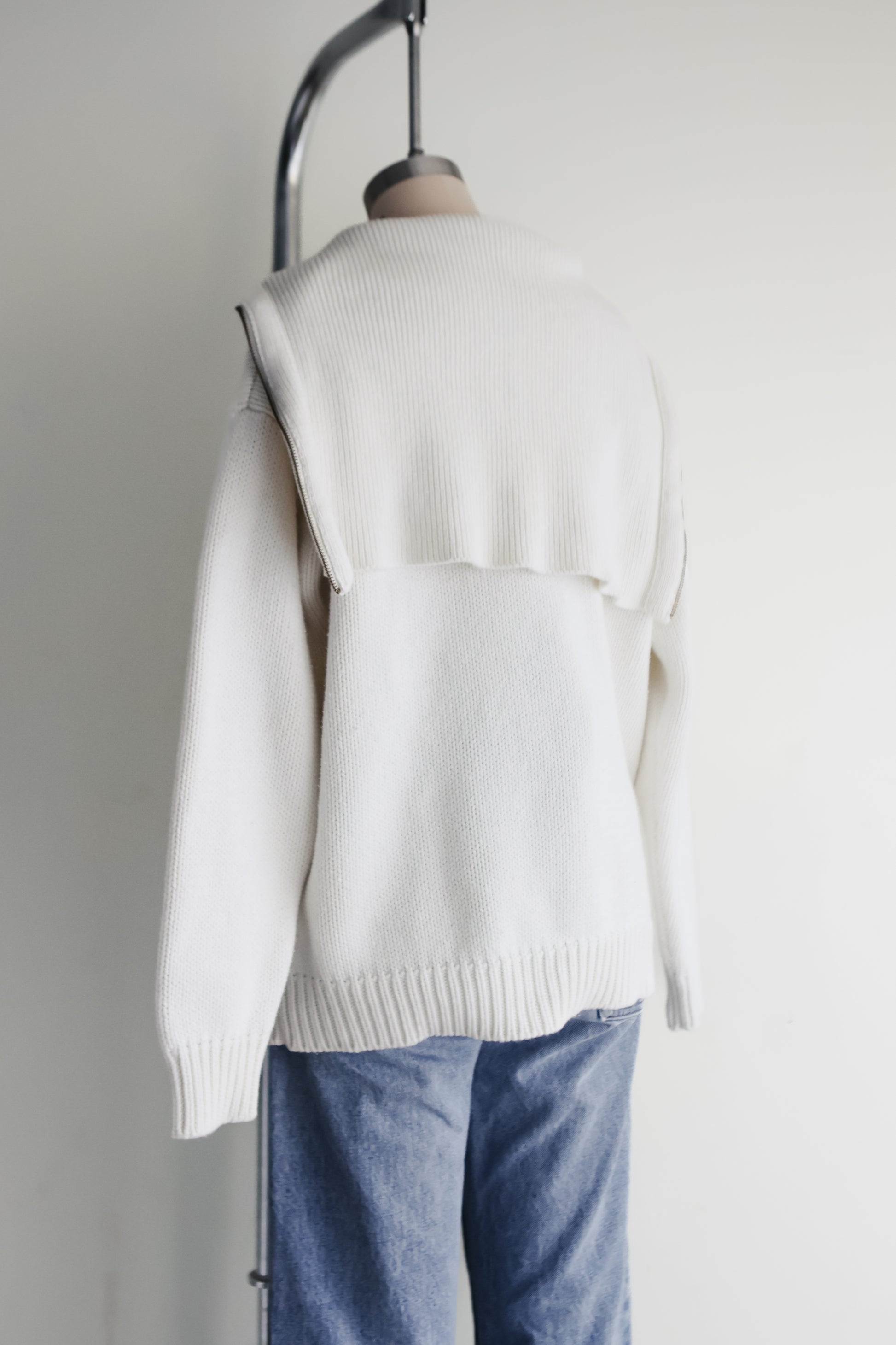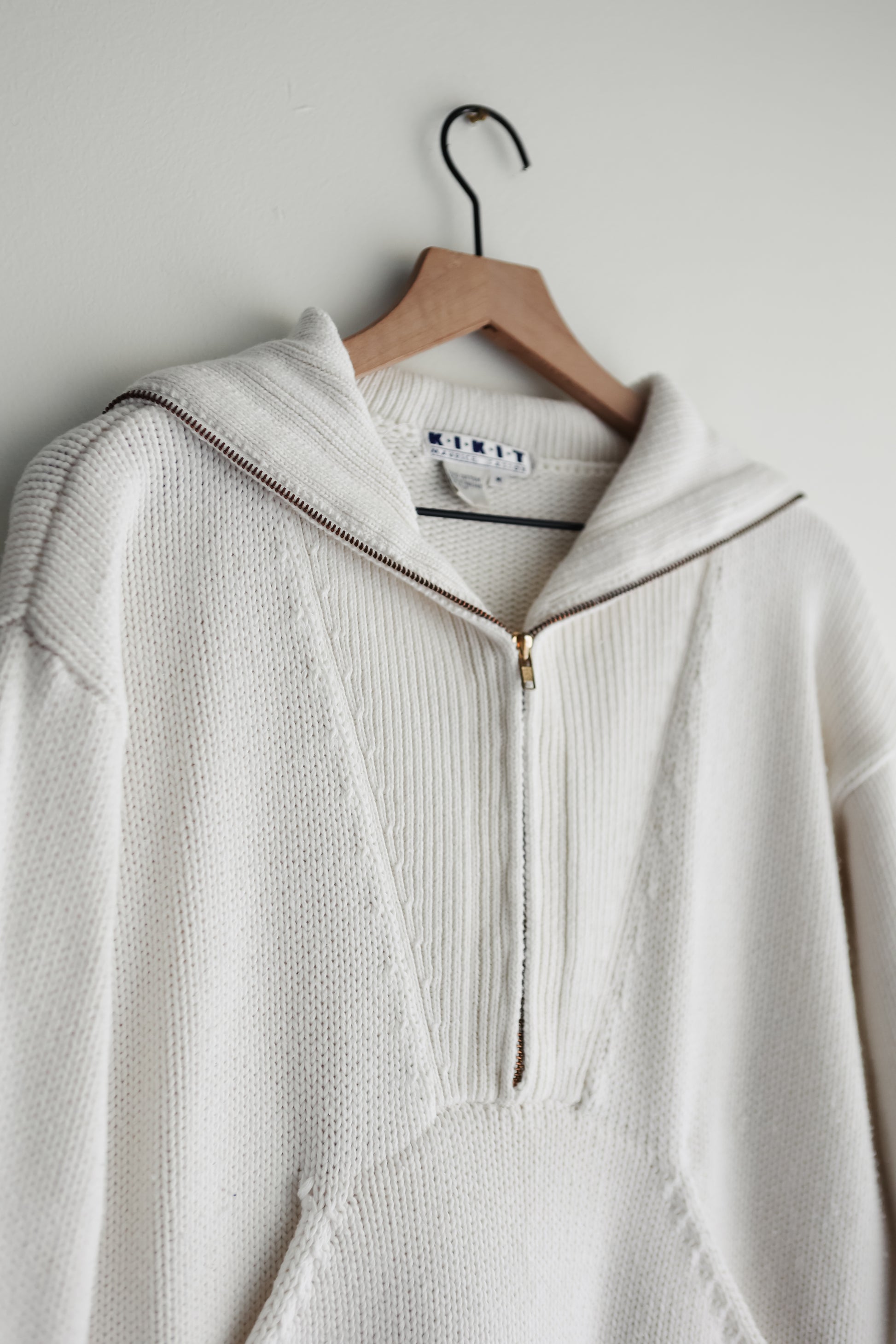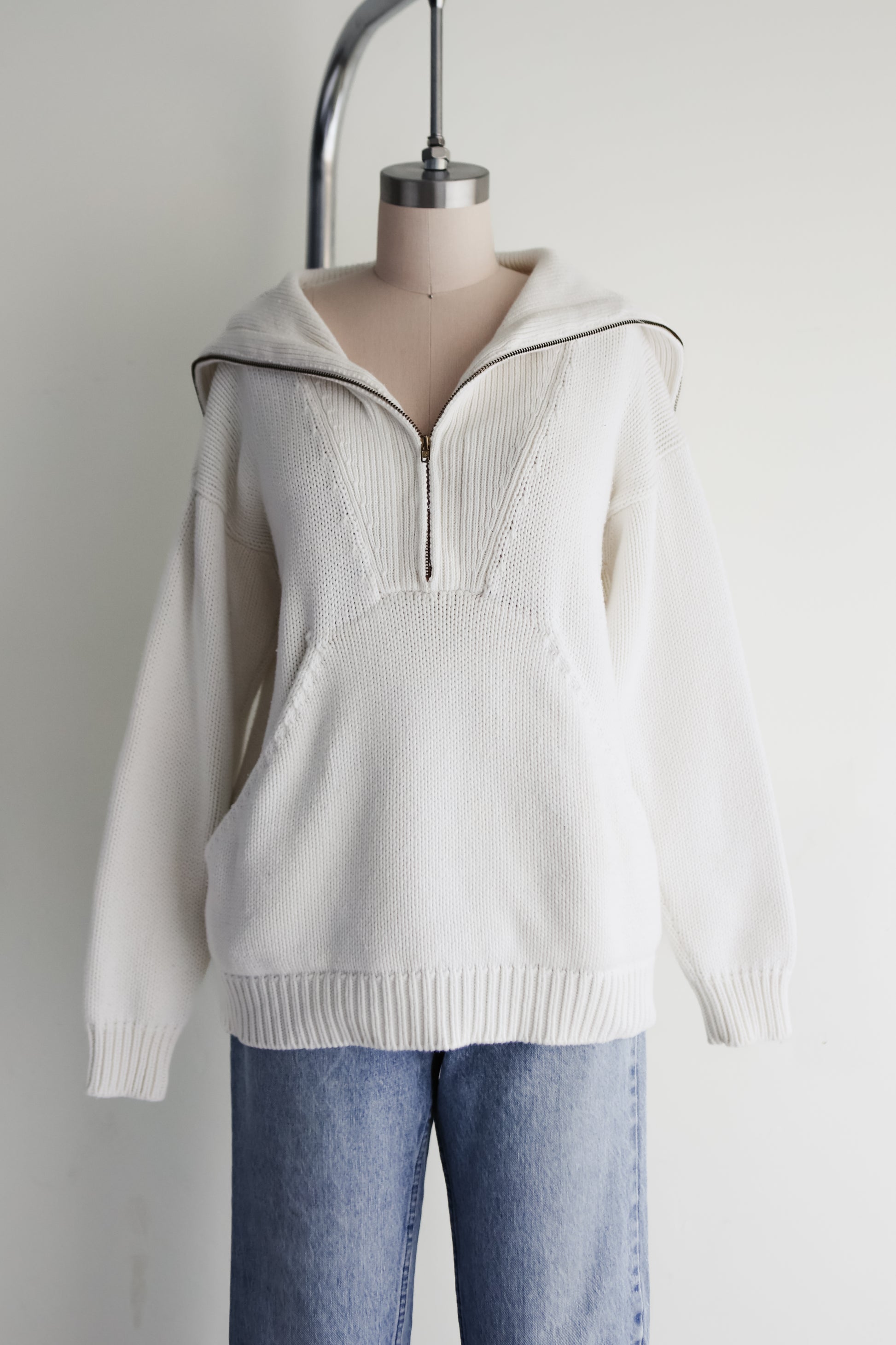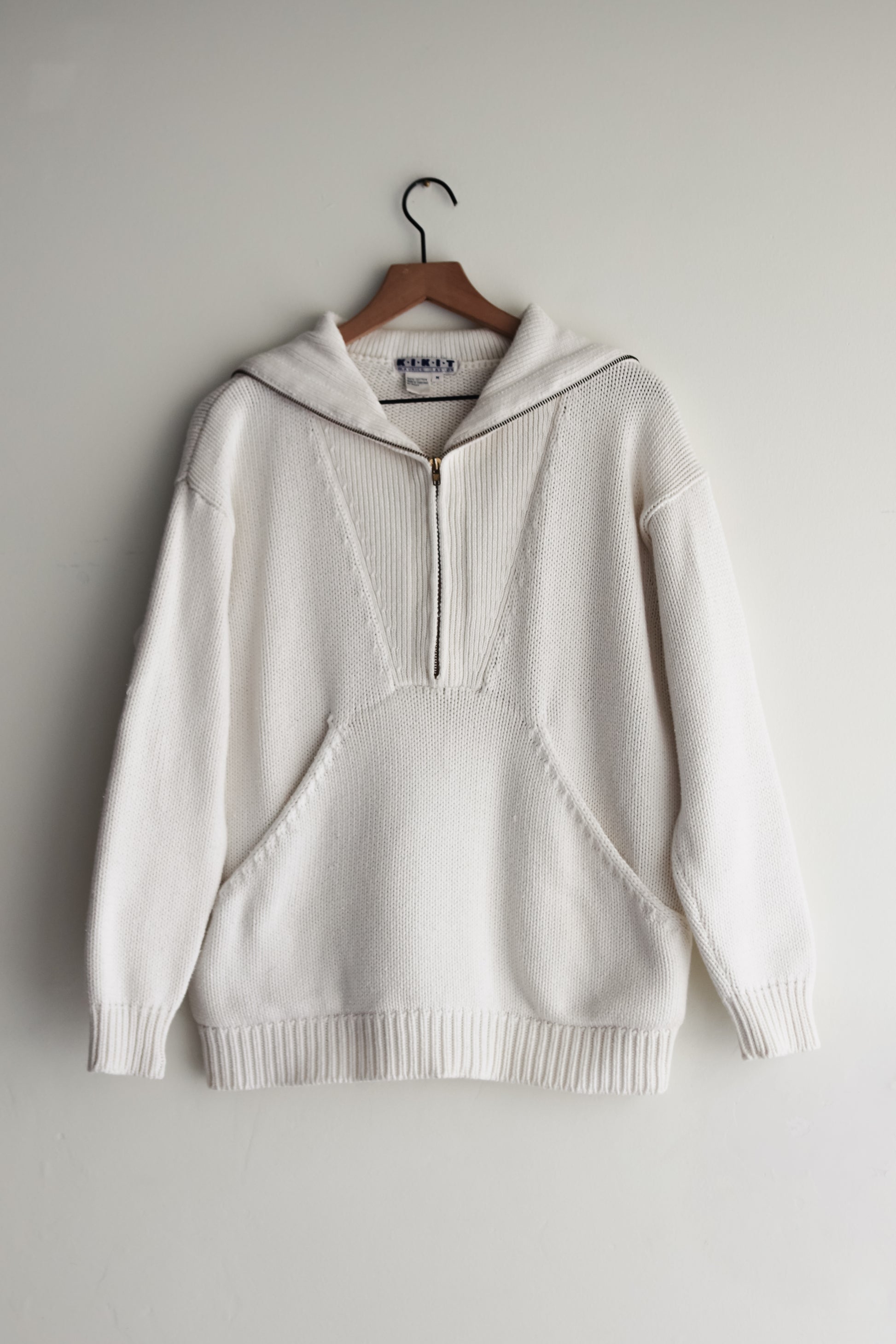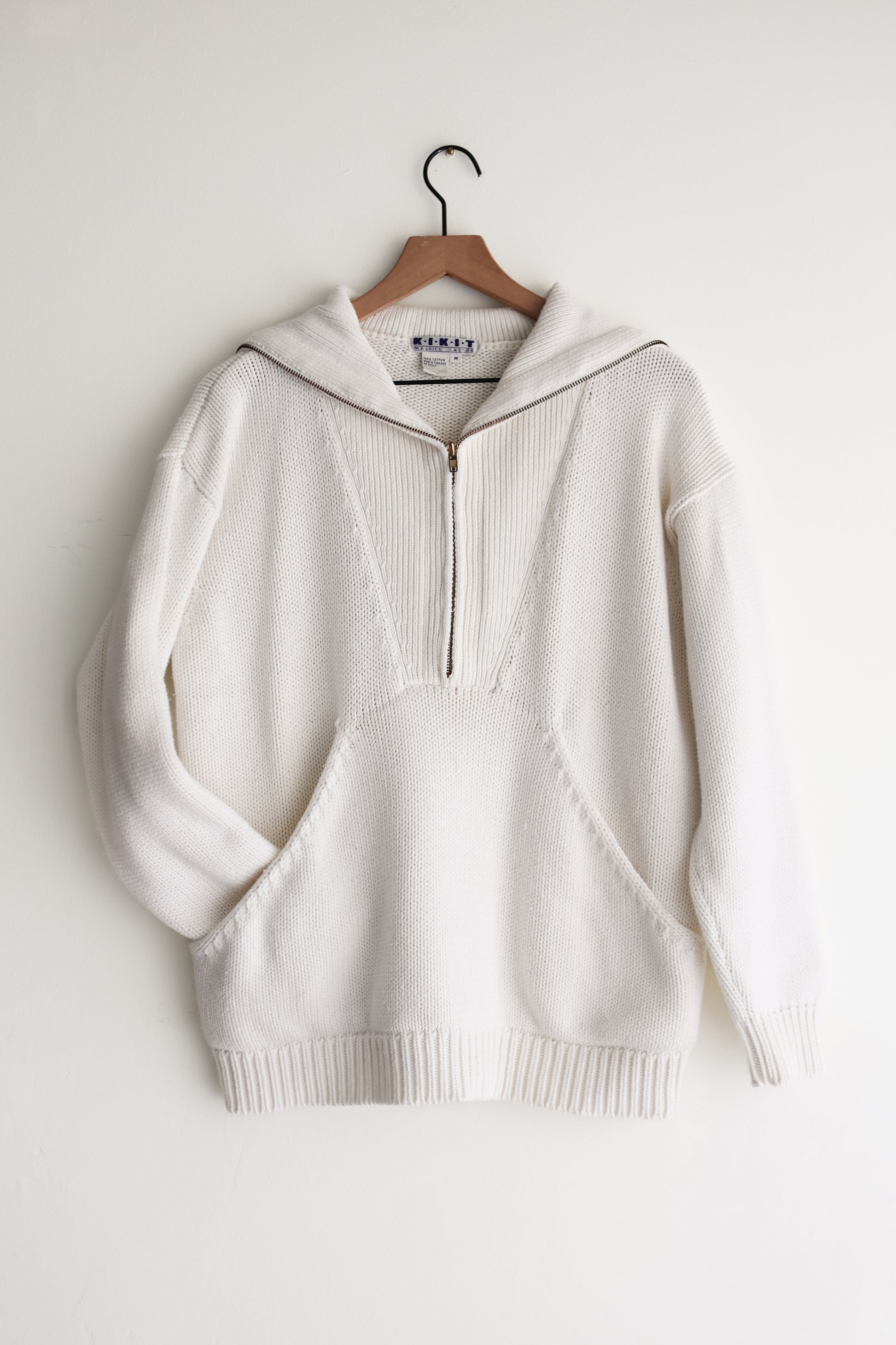 vintage white cotton neck sweater slouchy sweater with metal zip shawl collar and big kangaroo pocket.